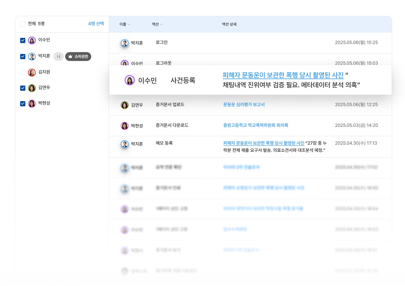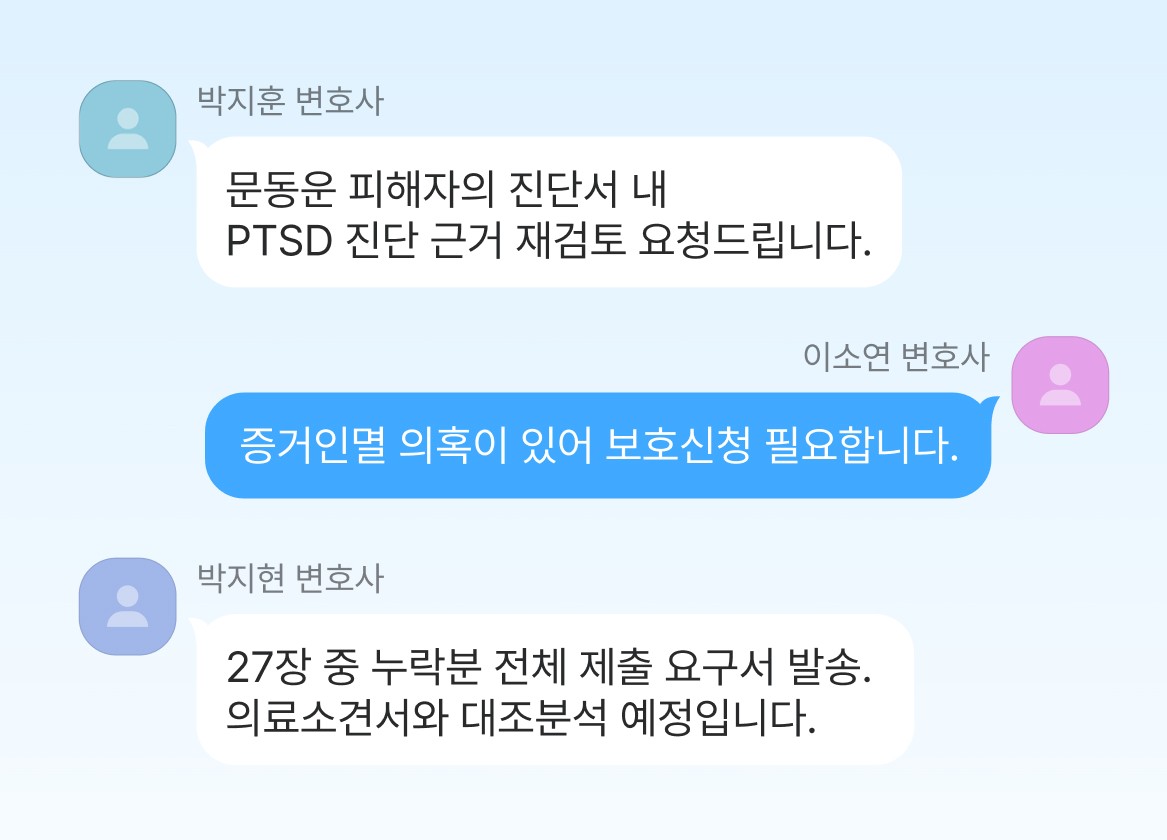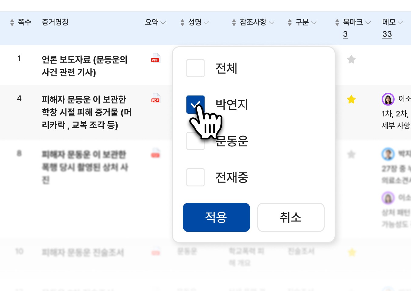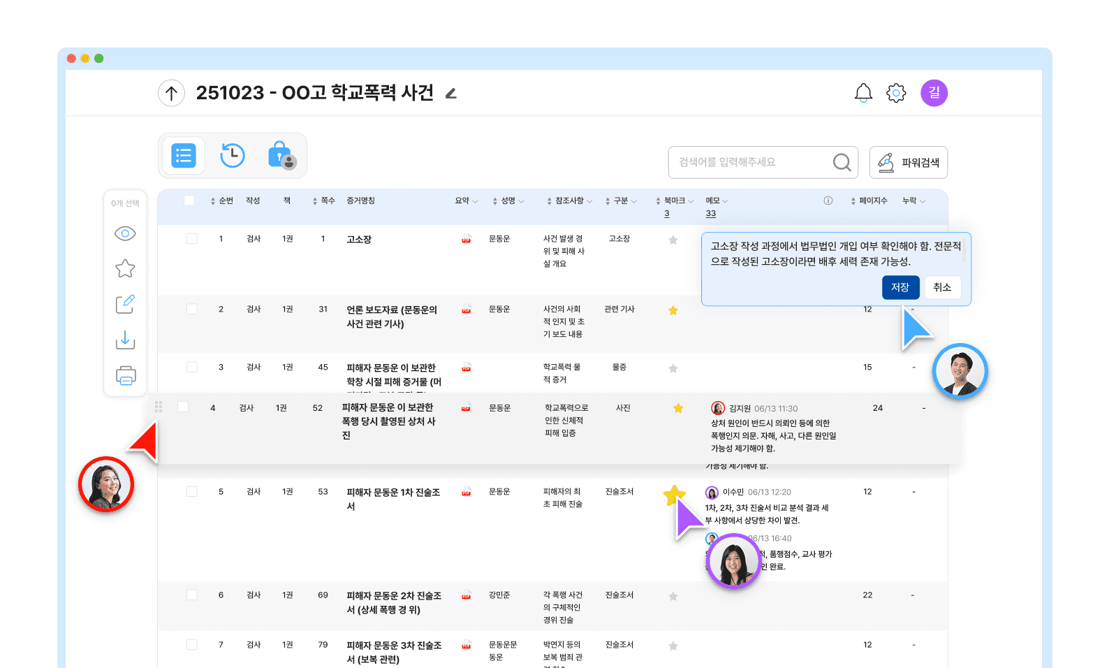 관련 인물, 증거 유형 등을 즉시 분류하여 지금 당장 필요한 문서만 선별할 수 있습니다.