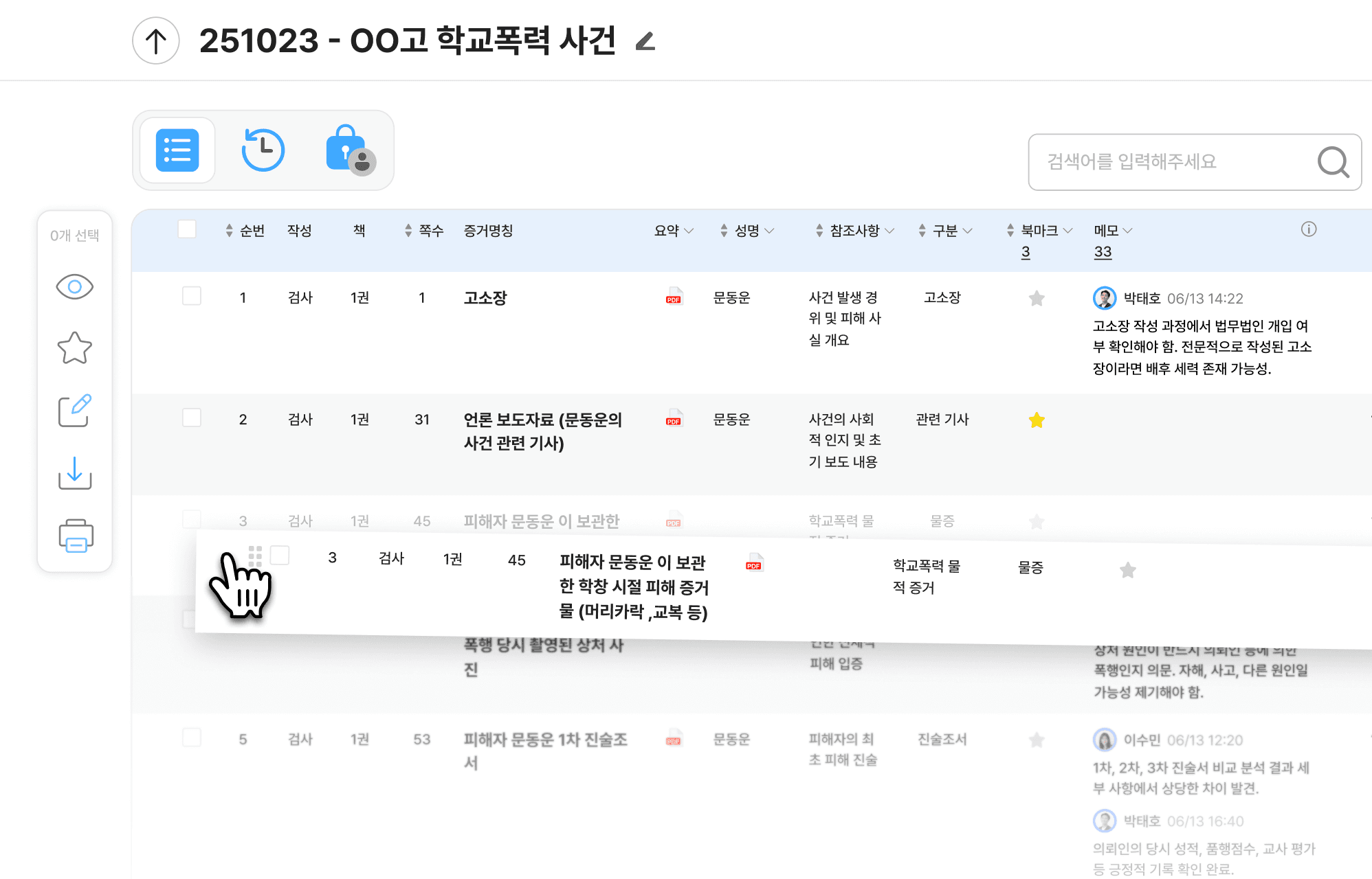 흩어진 관련 증거, 뒤섞인 중요도 증거를 관련도와 중요도에 따라 증거 목록 순서 변경